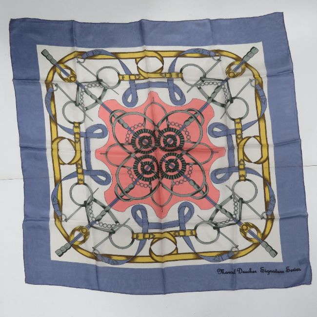 A silk scarf by Marcel Drucker Signature Series having a horse snaffle and bridle pattern, together with an unauthenticated (Chanel) scarf. Two items.