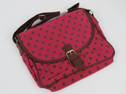 A red polka dot fabric handbag 'as new' 27 x 24cm.
