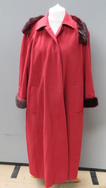 An Aqua Scutum of London felted coat with faux fur fringe in red, approx measurements 48" chest, 44" length to back, 14" underarm sleeve.