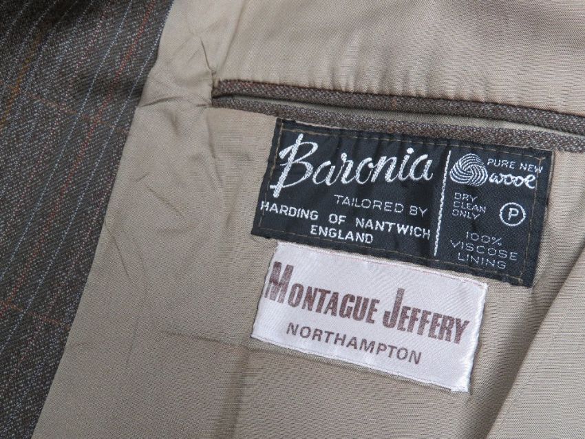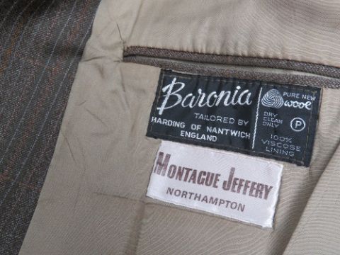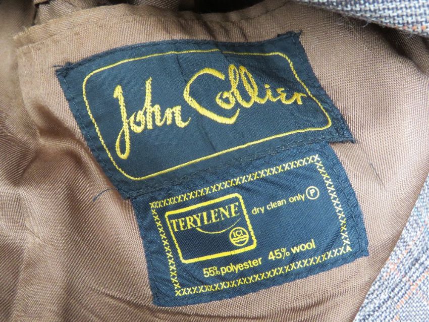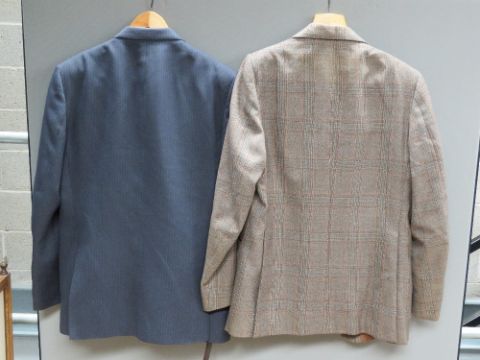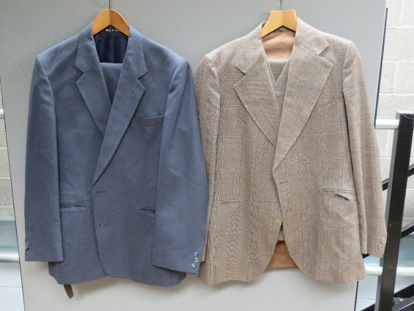 Men's vintage jacket and trouser suits inc 45%, 44" suit, pure wool green suit by Montague Jeffreys and a three piece suit being 45% wool by John Collier. Four items.