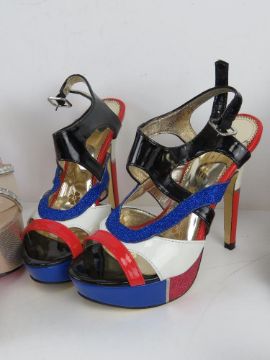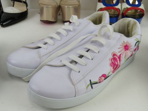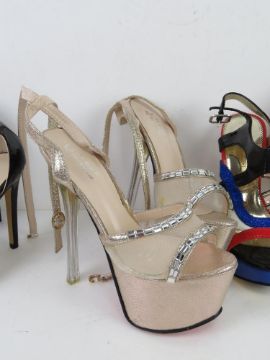 A quantity of assorted shoes inc platform, stiletto heels and trainers.