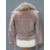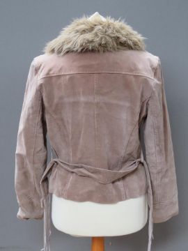 A suede type jacket having faux fur collar, labels partially removed, approx measurements; 36" chest, 23.5" length to back, 18" underarm sleeve.