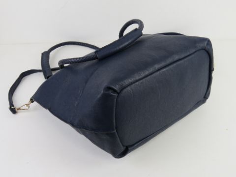 A navy blue tote bag with shoulder strap and woven handles, approx 30cm wide.