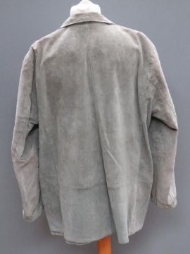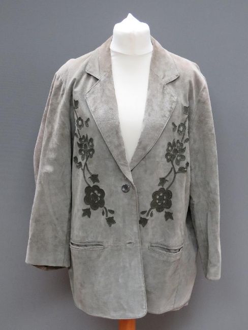 A green suede jacket having floral pattern upon by Beth Terrell, approx measurements; 48" chest, 32" length to back, 16.5" underarm sleeve.