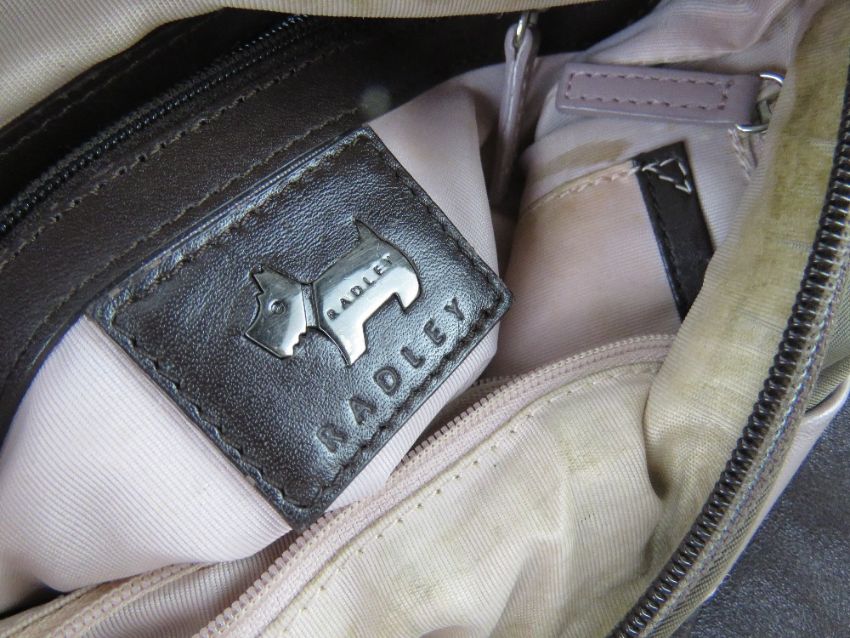 Radley; a brown cross body bag having pink dog key chain upon, approx 25cm wide.