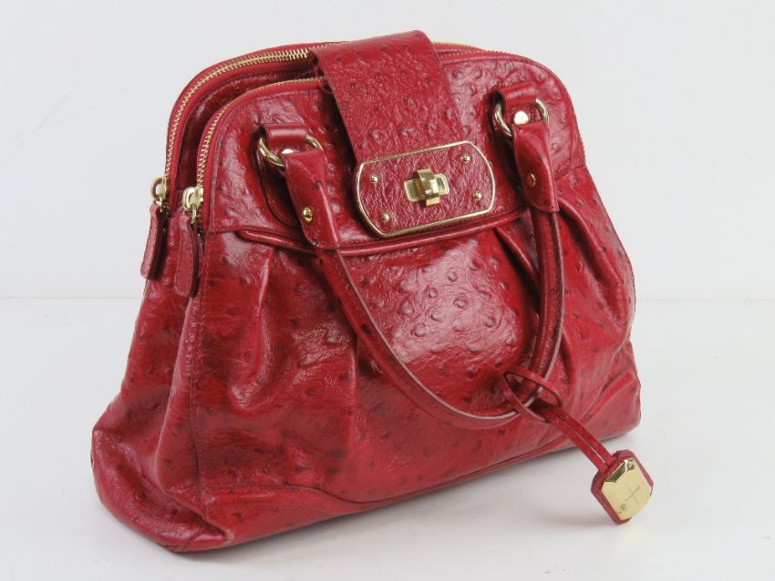 Jasper Conran; a red leather handbag having three sectional compartment approx 37cm wide.