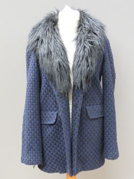 A ladies jacket in navy and black with faux fur collar, 10% wool, size 14.