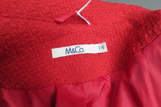 A 22% wool red coat size 14, approx measurements; 38" chest, 44" length to back, 16" underarm sleeve.