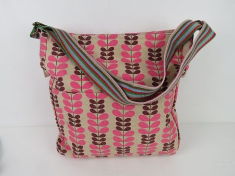 A fabric tote bag having leaf pattern in pink 'as new', approx 38 x 34cm.