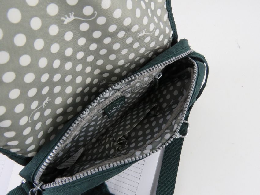 A green canvas cross body bag by Kipling having key chain upon, approx 23.5cm wide.