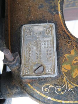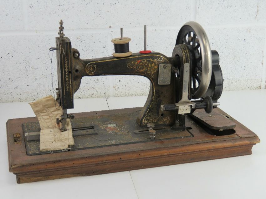A vintage sewing machine having floral decoration and mother or pearl inlay, with case marked Grecos.