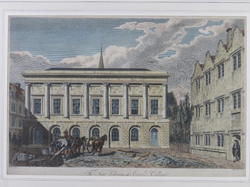 A coloured steel engraving of the New library at Oriel Collage Harris / Taylor within Hogarth frame, 64 x 49cm