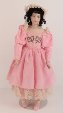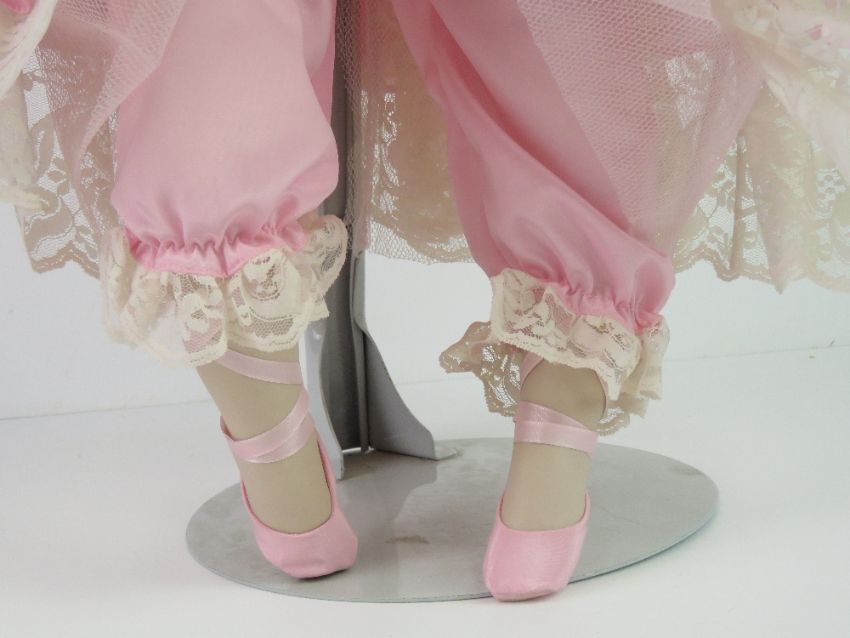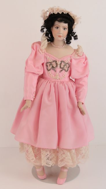 A handmade 20th century bisque headed doll made using an antique doll mould, having fine custom made outfit. In support frame, standing approx 63cm high.