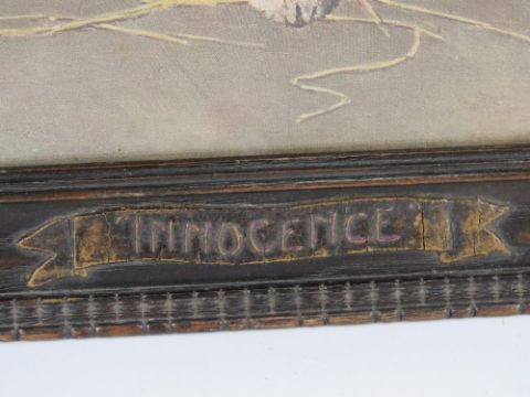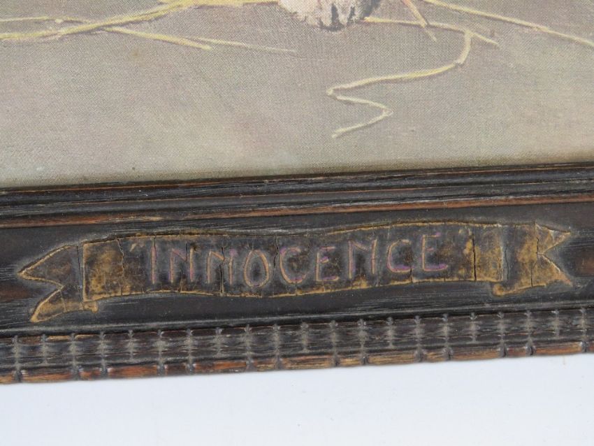 A carved oak frame 'Innocence' containing a print of a small white dog, sight size 19 x 24.5, overall size 28.5 x 34cm.