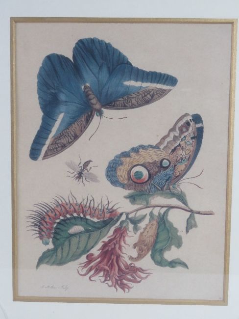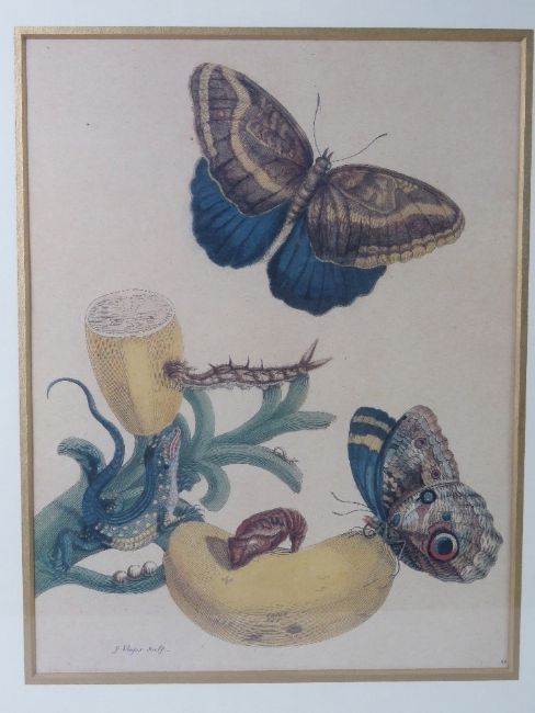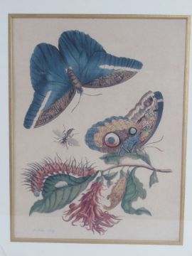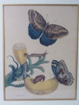 A pair of lepidoptera prints taken from lithographs held by The Zoological Society of London; The Life Cycle of the Insects of Surinam Marie Sybille Merion 1726 (dissertation sur la Generation et les transformations des insectes of Surinam) being MER07: Grand Atlas Butterfly and MER05: Bananas. Each measuring 34 x 26cm in matching glazed frames by Bright's of Nettlebed with certificates of authenticity (one glass A/F) Overall size 47 x 57cm each.