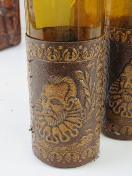 A set of six leather covered glasses with matching decanter and similar leather covered amber glass lidded water jug.