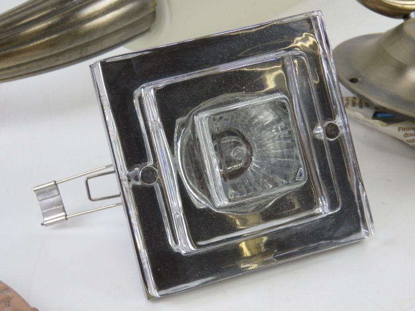 A quantity of wall light fittings including brass downlighting fitting.