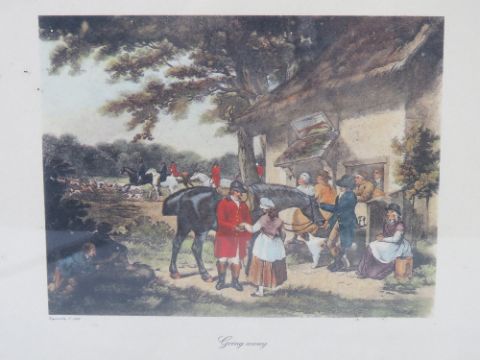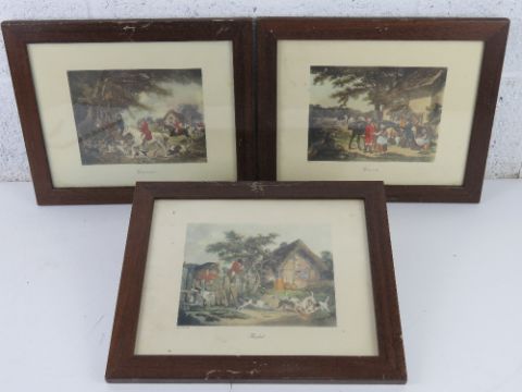A set of three hunting themed prints 'engraved by E Bell' each framed and glazed and measuring approx 34.5 x 28.5cm overall.
