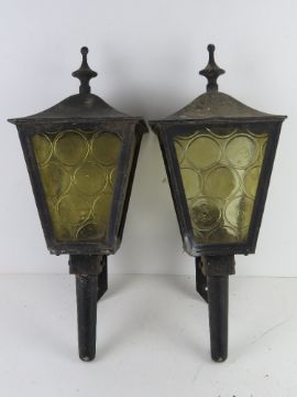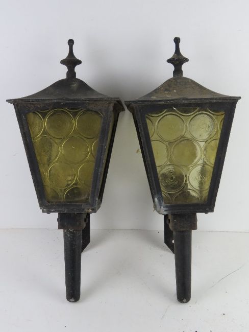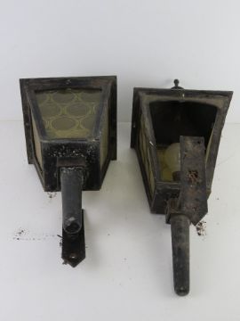Two black painted metal and glass 'carriage' type wall lanterns a/f.