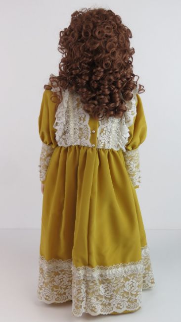 A handmade 20th century bisque headed doll made using an antique doll mould, having fine custom made outfit. In support frame, standing approx 73cm high.