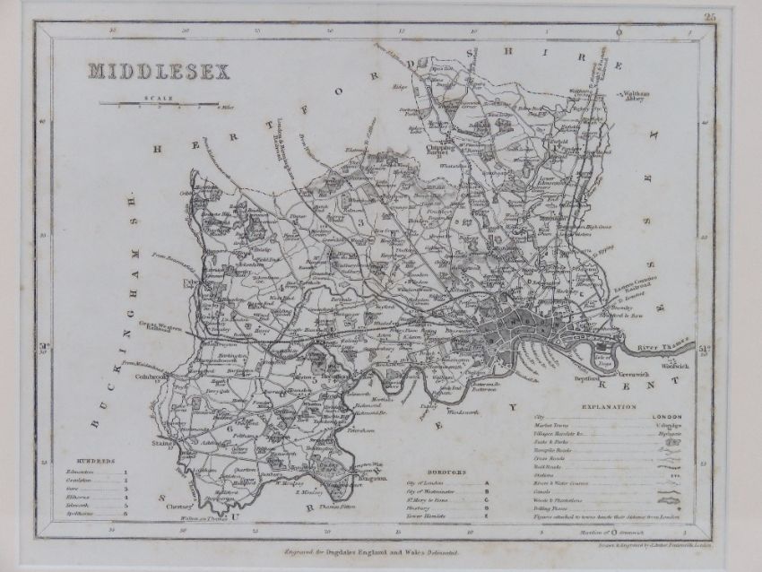 Maps; Three maps 'engraved for Dugdales England and Wales Delineated', two marked 'drawn and engraved by J Archer Pentonville London' being Norfolk and Middlesex, the other being of Cambridgeshire. All framed and mounted, various sizes, largest 40 x 33.5cm.