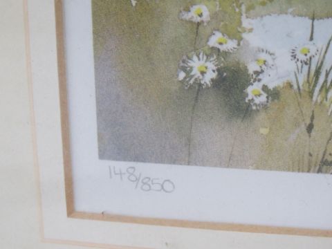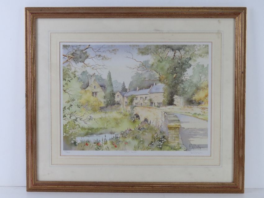 A signed limited edition print of Upper Swell having stone bridge over river leading to the village, from an original painting by KW Burton numbered 148/850 and signed and titled under in pencil. Sight size 35 x 25.5cm. Framed and mounted 53 x 45cm.