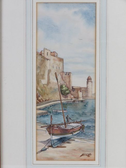 Watercolour Harbour scene, landed sailing boat before, fort and sky beyond. Signed lower right indistinct. 31 x 11.5 cm Framed and mounted overall size 50 x 29cm.