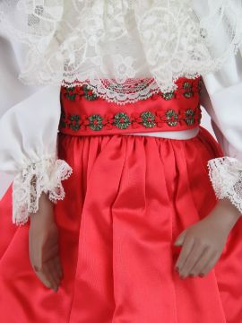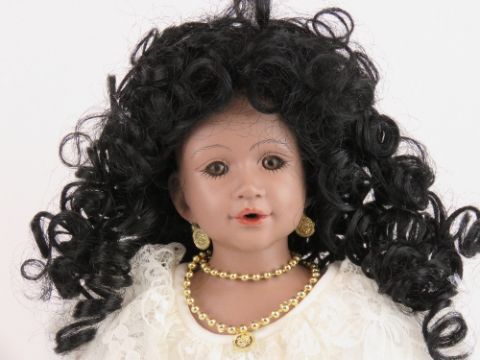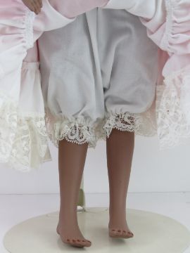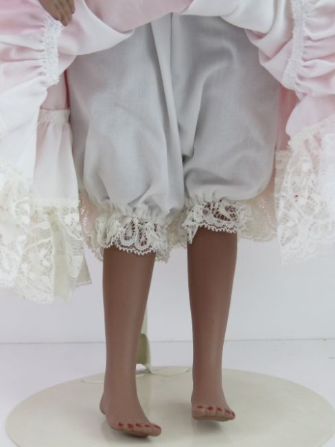 A handmade 20th century bisque headed doll made using an antique doll mould, having fine custom made outfit. In support frame, standing approx 50cm high.