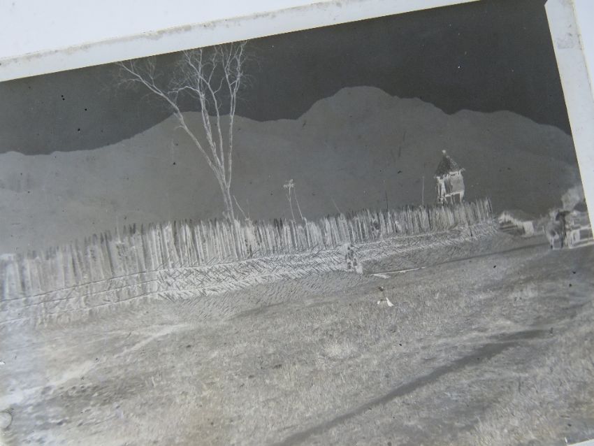 A quantity of black and white magic lantern type projector slides.
