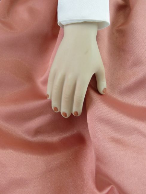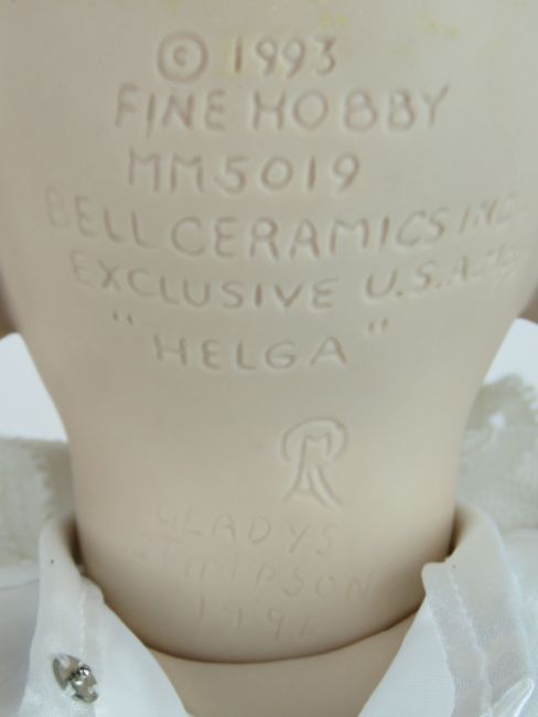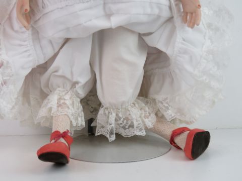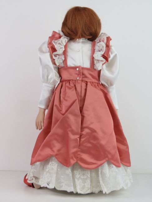 A handmade 20th century bisque headed doll made using an antique doll mould, having fine custom made outfit. In support frame, standing approx 54cm high.