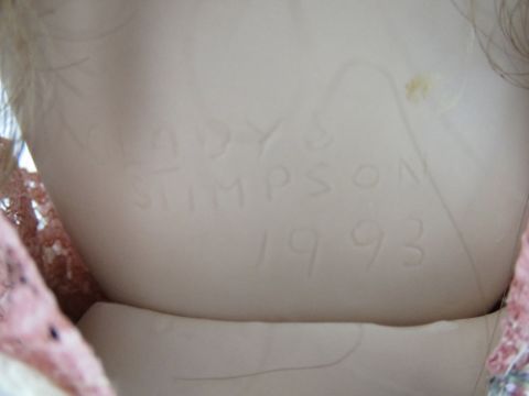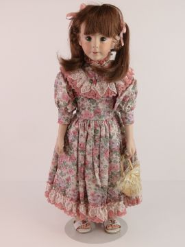 A handmade 20th century bisque headed doll made using an antique doll mould, having fine custom made outfit. In support frame, standing approx 68cm high.