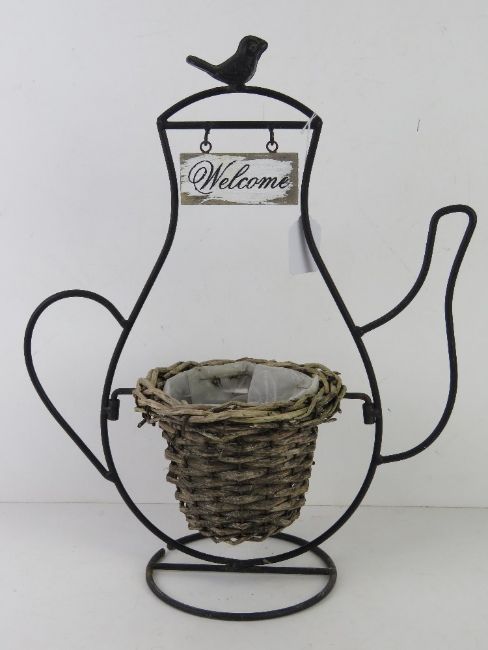 A teashop sign having wicker planter within black metal 'teapot' frame with Welcome sign over, all standing 43cm high.