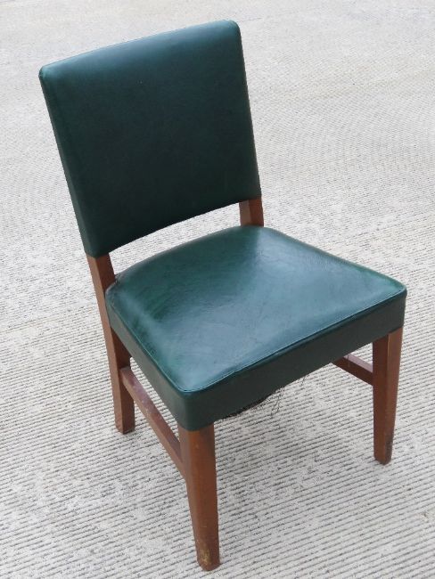 A single green leather office chair raised over mahogany frame.