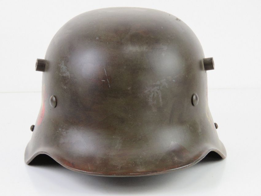 A reproduction M16 WWI/WWII German transitional Hitler Youth double decal camo helmet with liner.