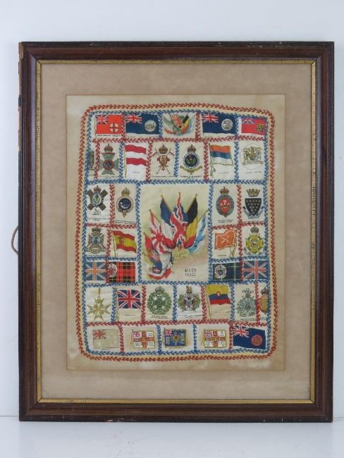 A montage of cigarette silks in military themes inc The Rifle Brigade, Kings Own Scottish Borders, Black Watch, Royal Scots Fusiliers, etc, framed and mounted, overall size 49 x 59.5cm.