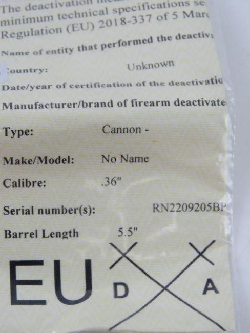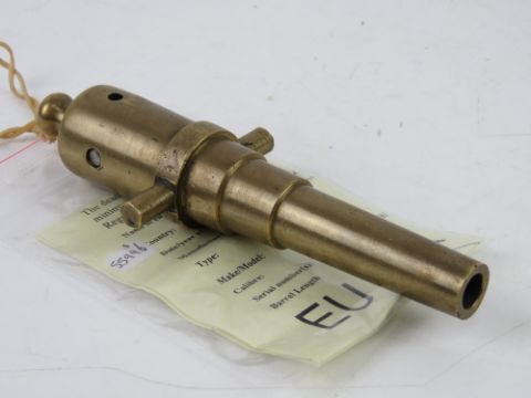 A deactivated brass .36 Calibre miniature tabletop cannon. 6"" overall length. With certificate.