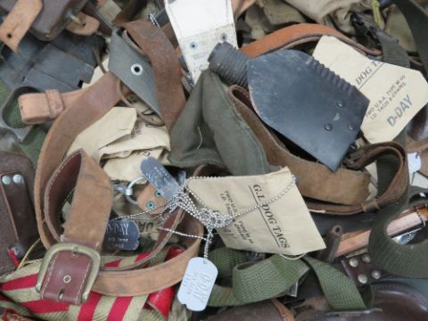 A quantity of assorted militaria inc shovel, leather gun case, Mosin pouches, 20 + D-DAY dog tags, slings, MG13 oil bottle, Garand sling, PPSH 41 mag pouch, leather slings, wooden stock, bayonet frogs, antique weapon parts, trigger guards, scabbards, magazine pouches, field belt, etc.