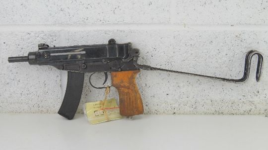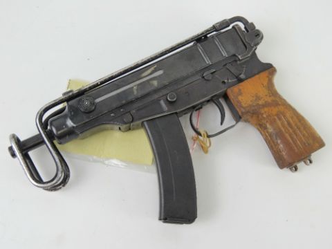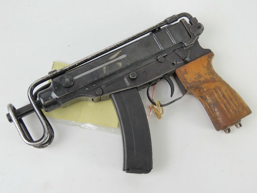 A deactivated Czech Skorpion Wz61 7.65mm Sub Machine Gun with slotted wooden grip. Latest EU Spec, with working dummy metal bolt (under spring pressure), moving safety and trigger, and removable magazine, with certificate.