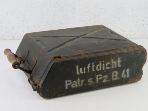 A WWII German Airtight Cartridge Case Patr.s.Pz B.41, to hold 12 Cartridges, one hinge a/f, ' J.D.VHAGAN JSERLOHN'? indistinct makers mark with Waffenamt stamp, having original paint and stencilling upon.