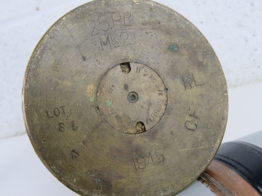 An inert WWII British 25pr shell case with a post war head and fuze, case dated 1945, projectile and fuze dated 1989, fuze unscrews.