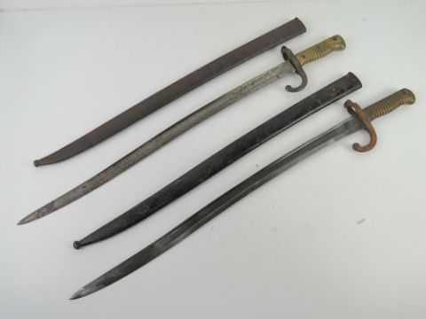 Two French Chassepot sword bayonets with scabbards, one engraved 1872 along the spine.