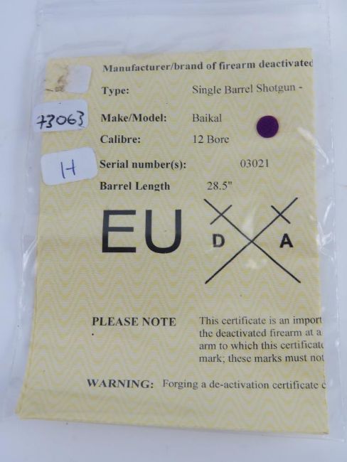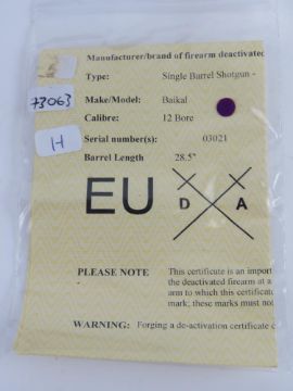 A deactivated Russian Baikal Single Shot 12 Gauge Shotgun. With certificate.