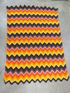 A retro hand knitted 1970s blanket measuring 134 x 92cm. Together with a set of six 1970s coloured wooden bead posters.