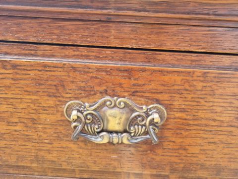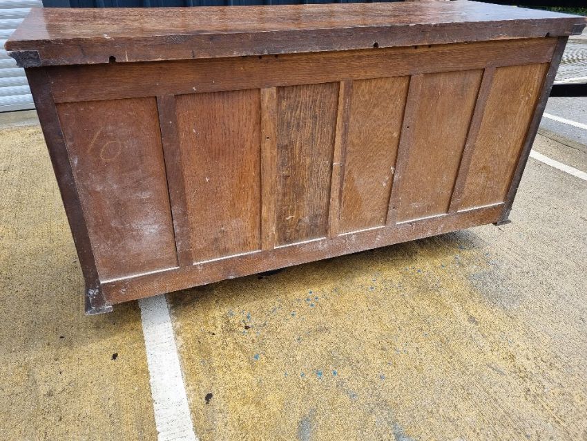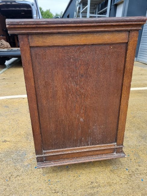 A late Victorian / Edwardian dresser base having three drawers each with vrass handles and escutcheon plates, with three doors, outer doors carved and recessed roundel decoration with moulding throughout.