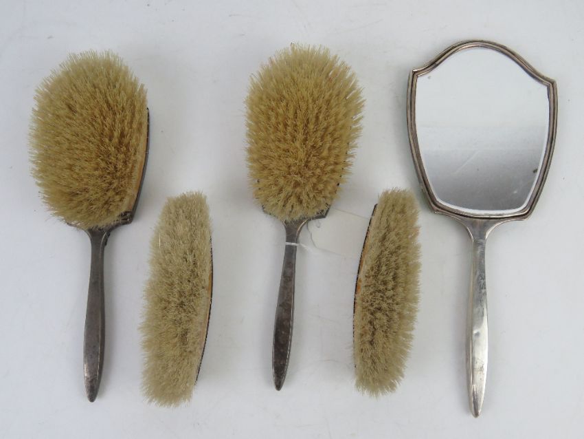 A HM silver guilloche engine turned enamel dressing table set comprising hand mirror, two hair brushes and two clothes brushes.