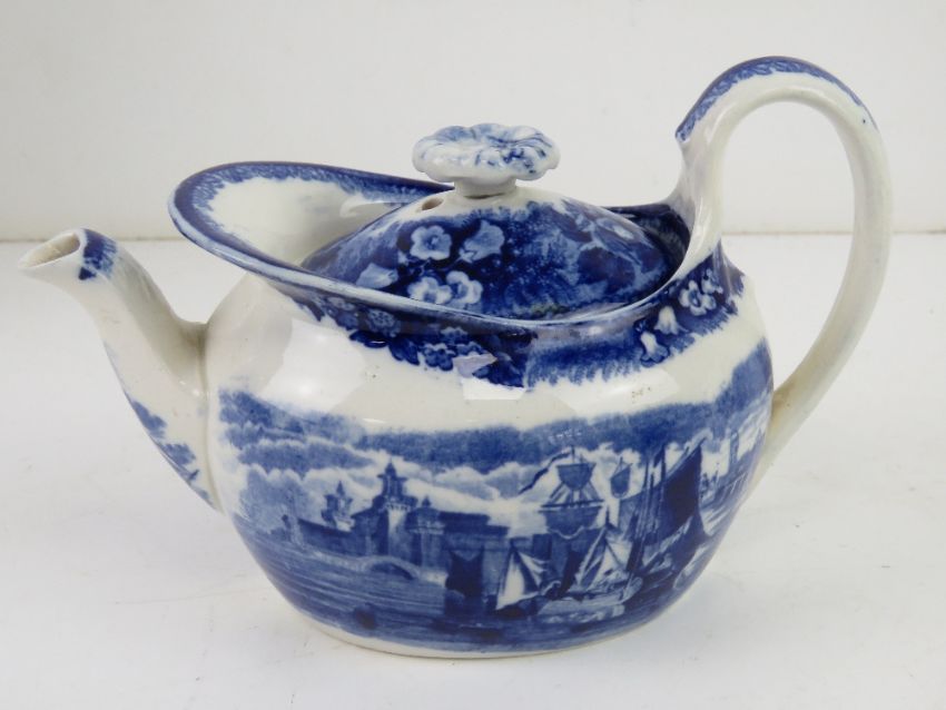An early 20thC teapot in the form of a shell together with a blue and white Wedgwood bachelor's teapot and a Gibsons gilded creamware teapot. Three items.