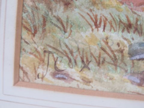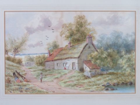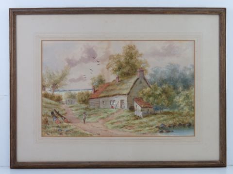Watercolour; study of a thatched cottage, pond beside trees beyond etc, late 19th century, monogrammed lower left 27 x 43cm.