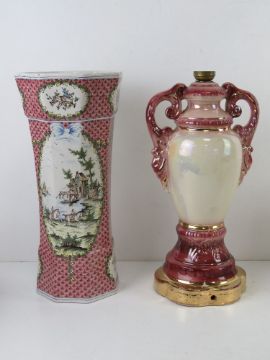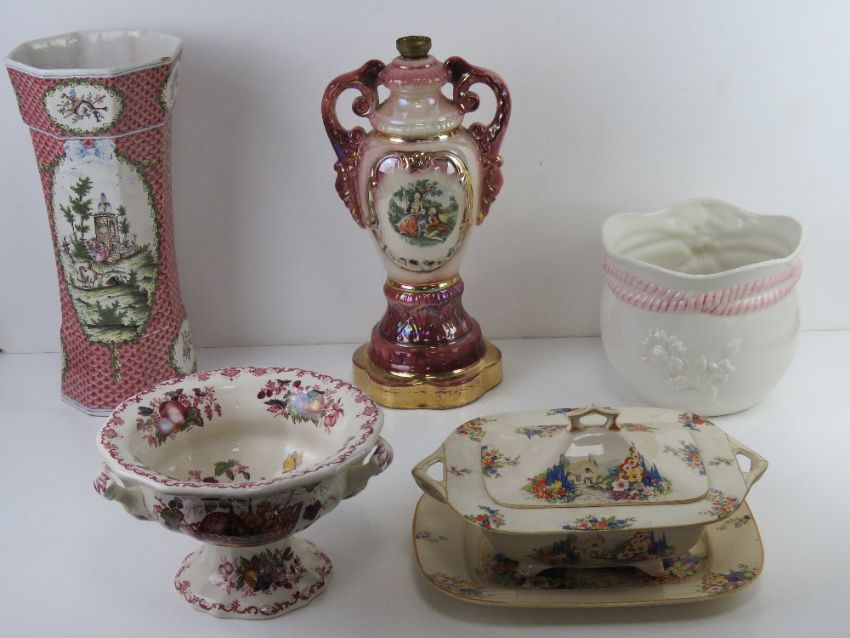 A Mason's Ironstone fruit basket in red and cream together with a quantity of other ceramics inc a tall octagonal vase in reds and pinks having water mill scenery upon. Five items.