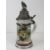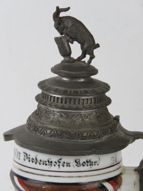 A military themed ceramic beer stein having pewter lid with horned goat upon, of German manufacture. All standing 28cm high. The base with lithophane