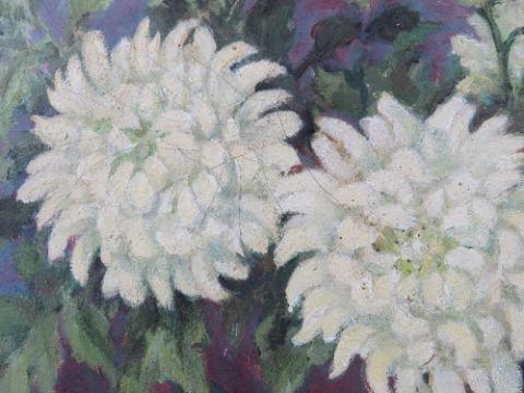 Acrylic on canvas of chrysanthemums, signed lower right Florence Fieldmouse, framed and measuring 59 x 49cm overall.